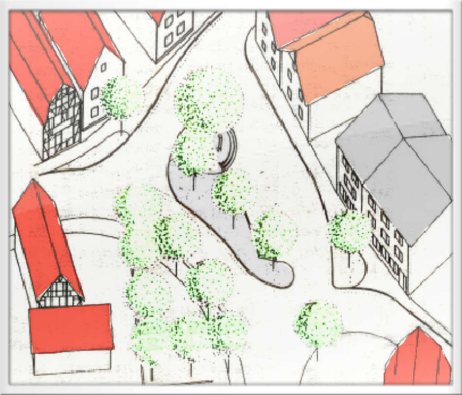 Entwurf für den neu gestalteten Dorfplatz mit neuen Bäumen und einem Parkplatz mit 6 Stellplätzen