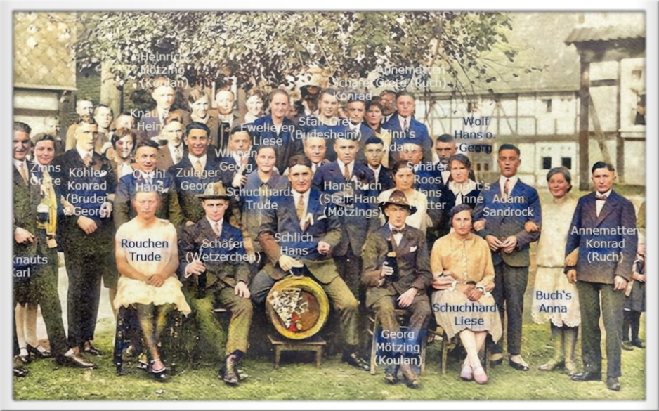 Kirmesgesellschaft incl. Kirmesburschen und Kirmesmädchen in fröhlicher Runde unter der alten Linde im Jahre 1928