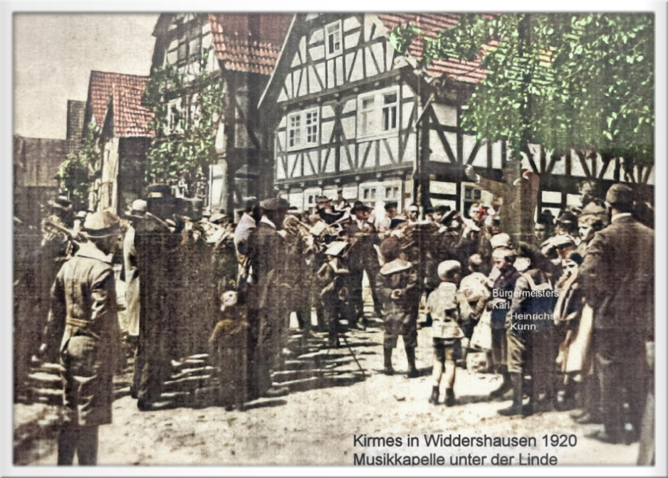 Die Musikkapelle spielte vor der alten Linde in der Dorfmitte Widdershausen um 1920