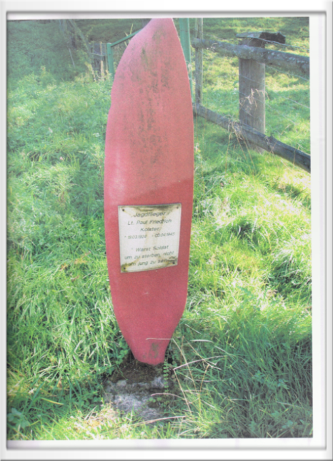 Markierung der Absturzstelle des Piloten Leutnant Paul Friedrich Kolster von der IV. Gruppe des JG 301 in Unterneurode, auf dem Schild ist zu lesen: Jagdflieger Paul Kolster *18.3.1924 + 3.4.1945 Warst Soldat um zu sterben, nicht um jung zu sein"
