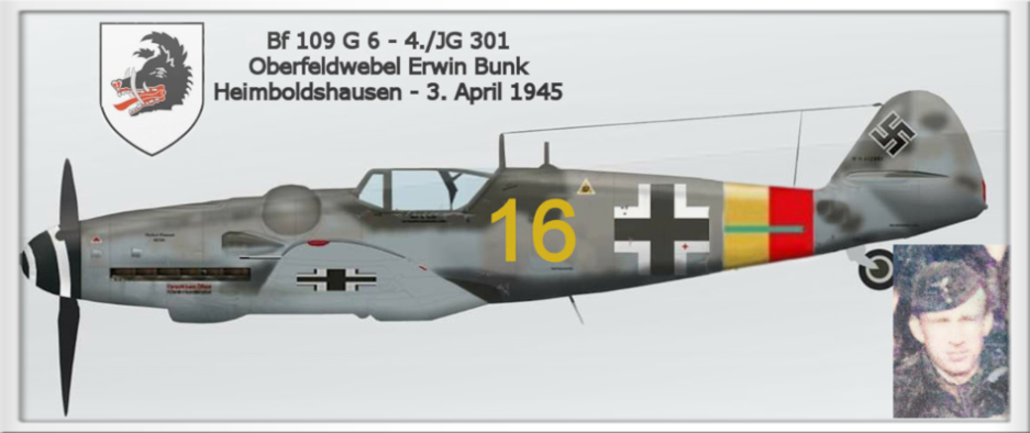Die Messerschmidt Bf 109 G-6 Jagdmaschine vom Oberfeldwebel Erwin Bunk, die am Angriff auf den Bahnhof von Heimboldshausen am 3. April 1945 beteiligt war. Die Maschine gehörte zur IV. Gruppe des Jagdgeschwaders 301, die zu diesem Zeitpunkt in Gardelegen stationiert war. OFw Bunk kam bei diesem Angriff ums Leben.