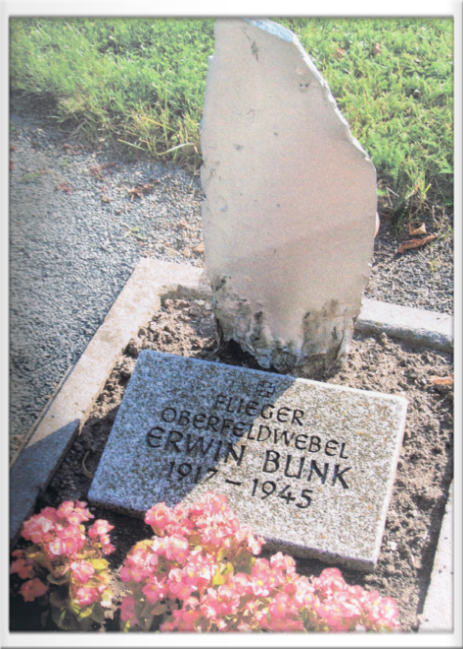 Grab des Piloten Oberfeldwebel Erwin Bunk von der IV. Gruppe des Jagdgeschwaders 301 auf dem Friedhof von Heimboldshausen, auf dem Grab ein Teil des Probellers seiner Me Bf 109 G-6.