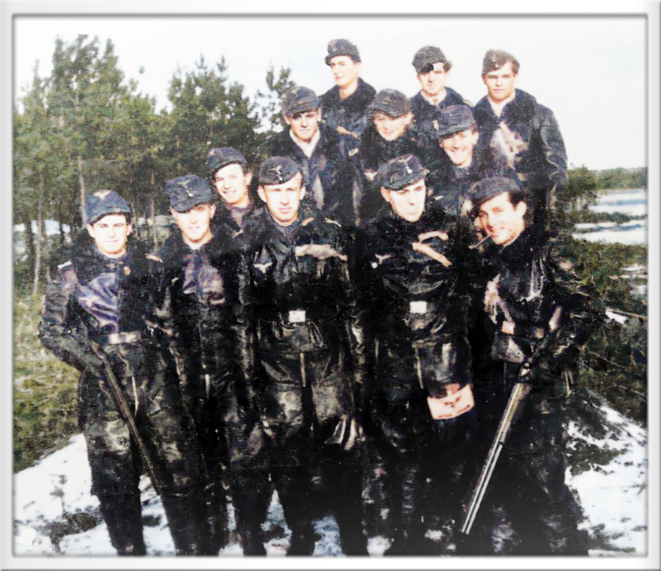 Piloten der IV. Gruppe des Jagdgeschwaders 301 beim Tontaubenschiessen. Vordere Reihe als dritter von links Oberfeldwebel Erwin Bunk. Rechts neben ihm Oberfeldwebel Willi Tiedtke, der den Angriff auf Heimboldshausen heil überstand. Das Foto stammt vom Flughafen bei Gardelegen aus dem Frühjahr 1945.