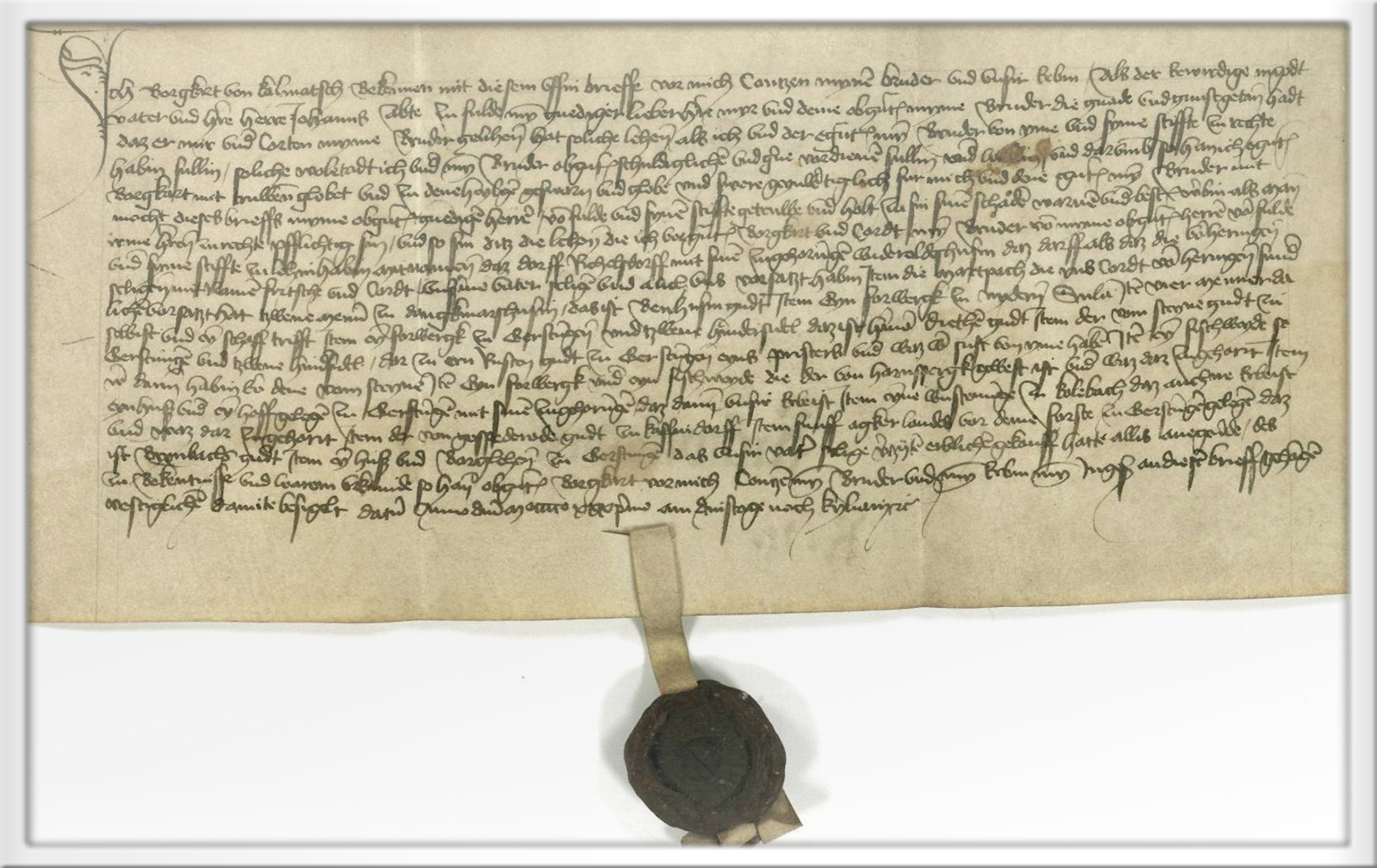 Burkhard von Kolmatsch (Kalmatsch) bestätigt für sich und seinen Bruder Konrad (Contz) die Belehnung mit dem Dorf Richelsdorf (Richelsdorff) [Ortsteil der Gem. Wildeck, Lkr. Hersfeld-Rotenburg], dem Dorf Widdershausen (Wideroldshusin) [Stadtteil der Gem. Heringen (Werra), Lkr. Hersfeld-Rotenburg], der Marbach (Martpach) [Wüstung, Gem. Heringen (Werra), Lkr. Hersfeld-Rotenburg] und weiteren im Einzelnen aufgeführten Lehen durch Johann [von Merlau], Abt von Fulda. Siegelankündigung. HStAM Bestand Urk. 76 Nr. 2373, 10.Juli 1431