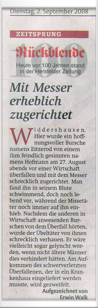 Widdershausen. Hier wurde ein hoffnungsvoller Bursche namens Eitzerod von einm ihm feindlich gesinnten namens Hofmann am 27. August 1908 abends vor einer Wirtschaft in Widdershausen überfallen und mit dem Messer erheblich zugerichtet.