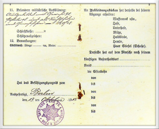 Besondere militärische Ausbildung: Ausbildung mit Gewehr 98, Pistole 08 und als Richtschütze und Gewehrführer mit Maschinengewehr MG 08 in Berlin.