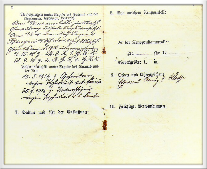 Versetzungen und Beförderungen: Am 18.05.1916 zum Gefreiten wegen Tapferkeit vor dem Feinde. Am 20.09.1916 zum Unteroffizier wegen Tapferkeit vor dem Feinde. Versetzung: Am 28.09.1916 im Rahmen der Neuformierung der MG-Kompanien zur 2.Maschinen-Gewehr-Kompanie 1. Garde-Reserve-Regiment versetzt