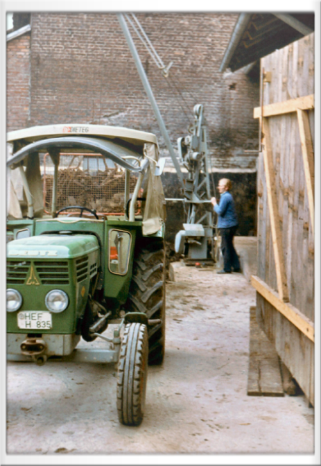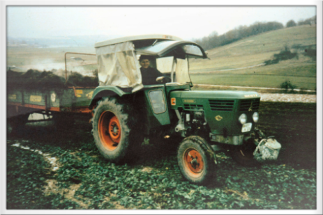 Werner Koch aus Widdershausen schleppt mit seinem Deutz-Traktor einen Mengele Miststreuer zum "Langen Strauch" und verteilt dort den Mist, der später untergeackert wird.