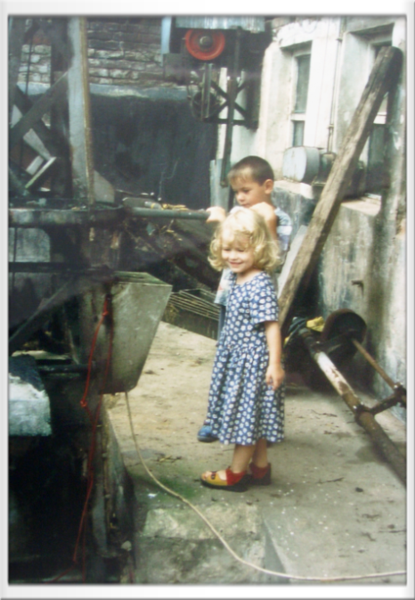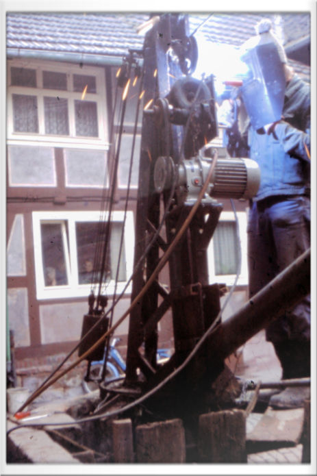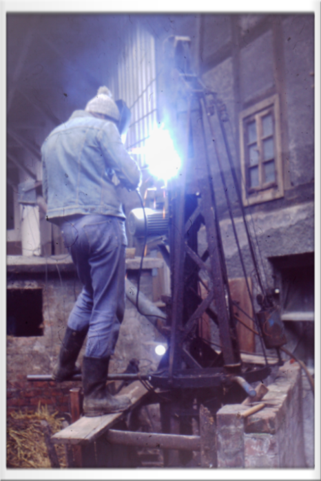 Unser Nachbar Reiner Schad beim Anschweißen eines Getriebemotors an den Weibach Mistgreifer im Hof der Brückengasse 1975