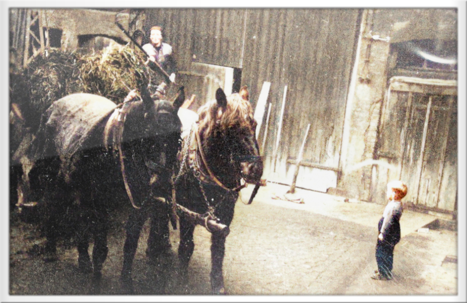 Aufladen von Mist in der Brückengasse in Widdershausen 1960. Der Mistwagen wird hier noch von den beiden Zugpferden Lotte (links) und Fuchs (rechts) gezogen. Elise Koch (1920-2014) korrigiert mit dem Misthaken die Ladung. Zuschauer auf dem Hof ist Bernd Koch.