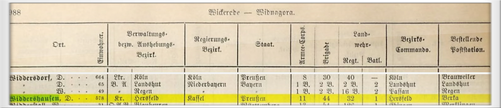 Widdershausen mit 578 Einwohnern gehörte 1887 zu Preußen im Regierungsbezirk Kassel, zum Militärischen Aushebungs-Bezirk Hersfeld mit der Zuordnung zum 11. Armee-Korps, der Brigade 44, 1. Bataillion und dem 32. Regiment.