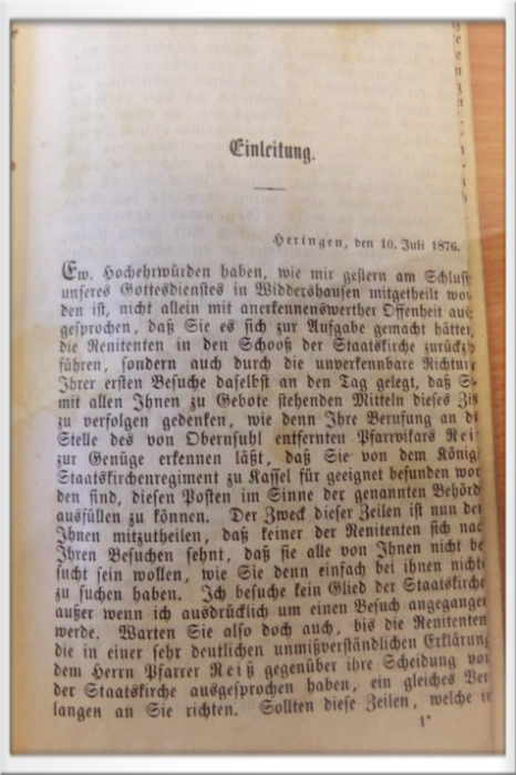 Ich besuche kein Kind der Staatskirche außer wenn ich ausdrücklich um einen Besuch angegangen werde. Warten Sie also doch auch, bis die Renitenten die in einer sehr deutlichen unmißverständlichen Erklärung dem Herrn Pfarrer Reiß gegenüber ihre Scheidung von der Staatskirche ausgesprochen haben, ein gleiches Verlangen an Sie richten. Sollten diese Zeilen, welche in Unterstellung eines gewissen Zartgefühls*) auf Ihrer Seite geschrieben sind, ihren Zweck verfehlen, so würden die Renitenten zu Widdershausen, welche nicht fleischlicher Waffen sich bedienen möchten, genöthigt sein, durch eine von ihnen allen unterzeichnete und dann auch der Oeffentlichkeit zu übergebende Aufforderung an Sie gegen etwaige Zudringlichkeiten sich sicher zu stellen. Uebrigens lade ich Sie hierdurch ein, an irgend einen der nächstfolgenden Sonntage einmal einen unserer Gottesdienste zu besuchen, welche des Nachmittags gegen halb drei Uhr ihren Anfang nehmen. Da mögen Sie denn, nach Beendigung desselben, wozu ich Ihnen hierdurch ausdrückliche Erlaubnis gebe, meiner Gemeinde das Wesen der Staatskirche in meiner Gegenwart auseinandersetzen, denn wenn Sie sich wirklich stark genug fühlen, "mit dem Worte die Renitenten zu vernichten", so dürfen Sie als ehrlicher und wahrheitsliebender Mann wohl auch geneigt sein, dies in Gegenwart eines renitenten Pfarrers fertig zu bringen.