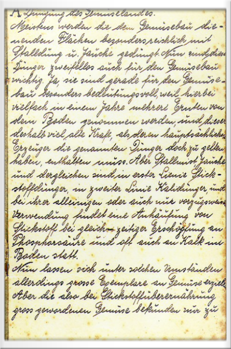 Seminare im Landwirtschaftlichen Verein des Stobs Camps, hier die erste Textseite der Mitschrift durch Nikolaus Trieschmann, sie beginnt mit der Düngung des Gemüselandes und es folgt die Düngung der Obstgärten