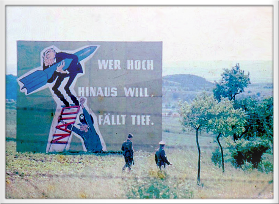 Der Beamte des Bundesgrenzschutzes zur besonderen Verwendung (ZBV) Kurt Ernst neben einer Propagandatafel bei Bodesruh