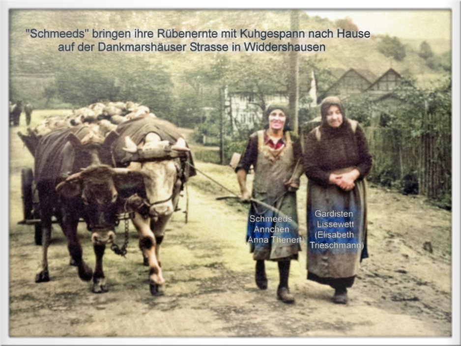 Anna Thenert (geb Quehl 1907) führt das Kuhgespann mit vollgeladenen Rüben nach Hause, sie wird begleitet von Elisabeth Trieschmann (Gardisten Lissewett) mit Kötze auf dem Rücken. Im Hintergrund folgt ihr Mann Georg Thenert (Schmeeds Schorsch,1905) ebenfalls mit einem Rübenwagen