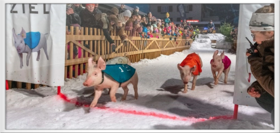 Das traditionelle Schweinerennen (Hotschrennen) in Klosters in der Schweiz, hier beim Zieleinlauf.
