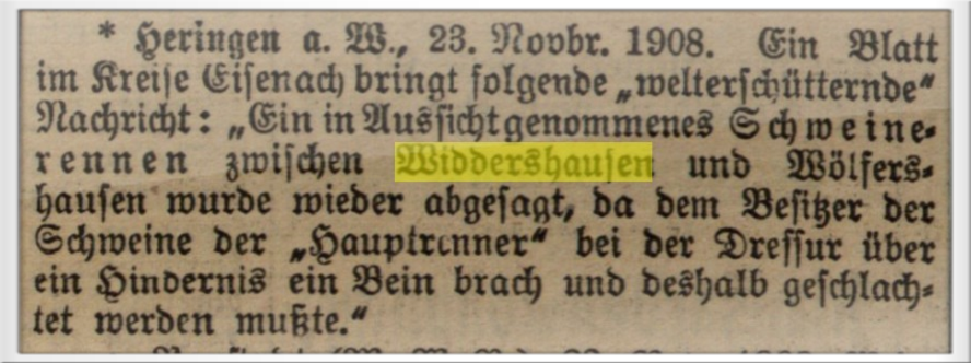 Das Schweinerennen musste abgesagt werden, aus der Fuldaer Zeitung vom November 1908