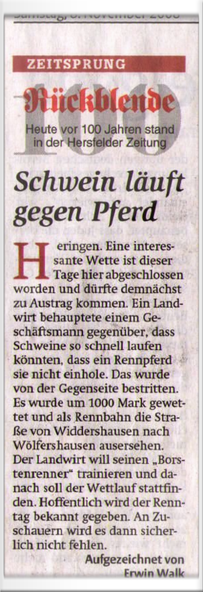 Heringen. Eine interessante Wette ist dieser Tage hier abgeschlossen worden und dürfte demnächst zum Austrag kommen. Ein Landwirt behauptete einem Geschäftsmann gegenüber, dass Schweine so schnell laufen könnten, dass ein Rennpferd sie nicht einhole.