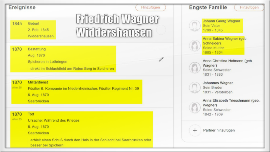 Es war der Füsilier Friedrich Wagner (2.2.1845-6.8.1870) aus Widdershausen, er gehörte dem Niederrheinischen Füsilier-Regiment 39 an und wurde schon im ersten Gefecht auf den Höhen bei Spicheren (bei Saarbrücken) durch einen Schuß in den Hals am 6.8.1870 getötet.