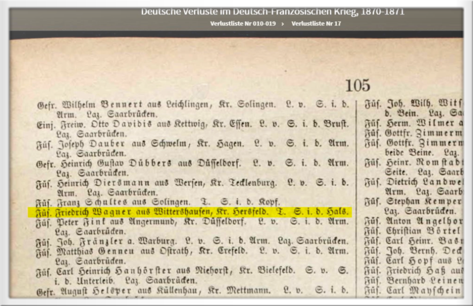 Verlustliste Nr. 17 aus dem Deutsch-Französischen Krieg 1870 mit dem Eintrag über Friedrich Wagner aus Widdershausen, er gehörte dem Füsilier Regiment 39 an