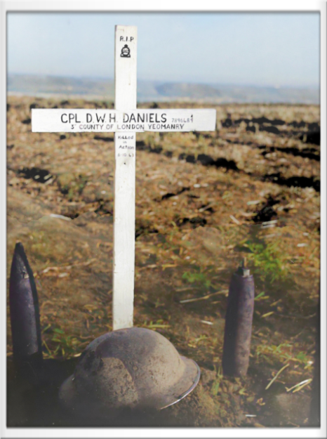 Das Grab von Corporal David William Higham (Bebe) Daniels, 22 Jahre alt verbrannte in seinem Sherman Panzer, 3rd County of London Yeomanry (Sharpshooters), Der Kommandant des Panzers, der Corporal Michael Carter, starb später an seinen Wunden, ebenfalls nur 20 Jahre alt, der Sherman wurde bei Termoli abgeschossen, Termoli 6. Oktober 1943, Photograph by Major Wilfred Herbert James Sale
