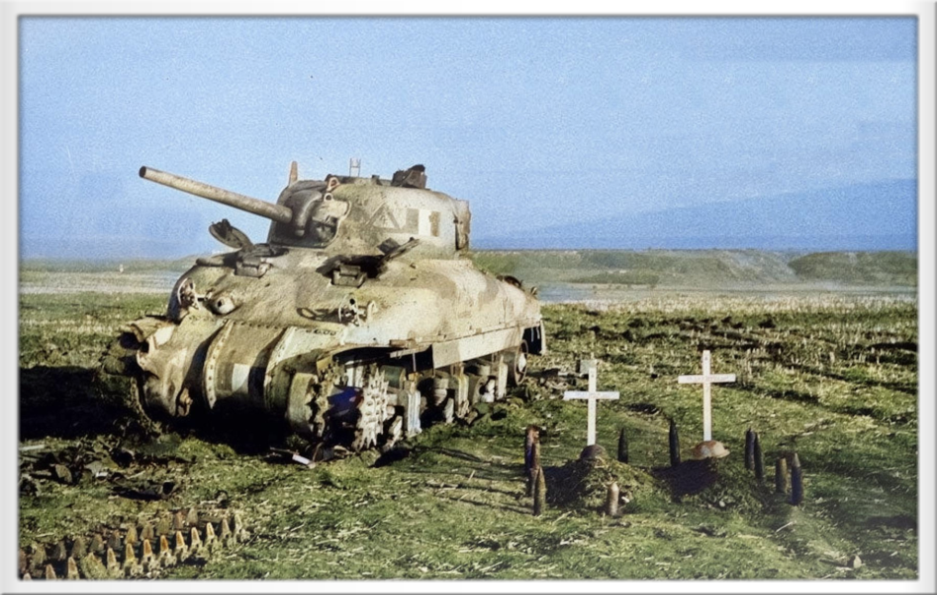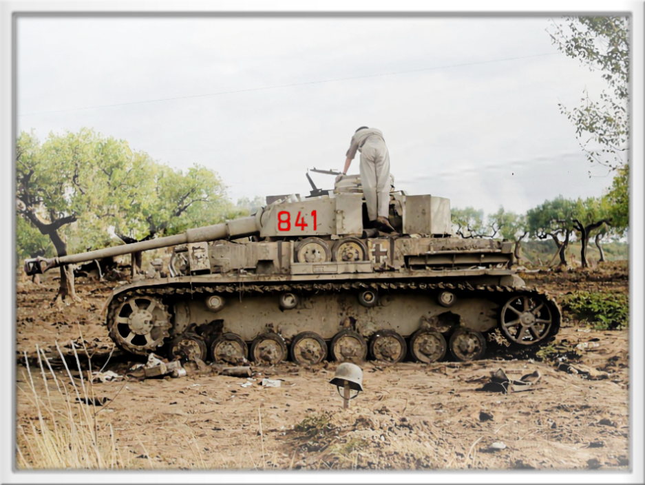 Ein Soldat des 12th Canadian Tank Regiment (Three Rivers Regiment) untersucht einem zerstörten Panzer IV (Nummer 841) der 16. Panzer Division bei Termoli am 9. Oktober 1943, davor das Grab eines Soldaten der deutschen Besatzung