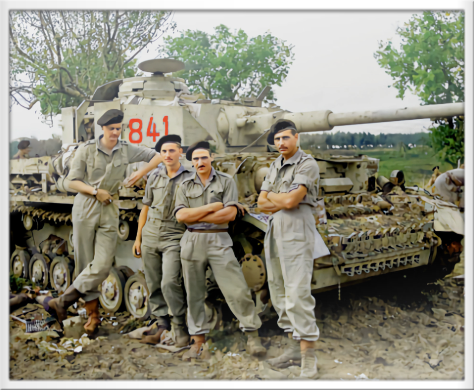 Kanadische Panzer Besatzung der 12th Canadian Tank Regiment (Three Rivers Regiment) posiert vor einem zerstörten Panzer IV (Nummer 841) der 16. Panzer Division bei Termoli am 9. Oktober 1943