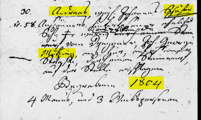 Andreas Johannes Schäfer wurde im Alter von 32 Jahren erschlagen und am 30. Jul. 1804 von Pfarrer Johannes Raßmann beerdigt.