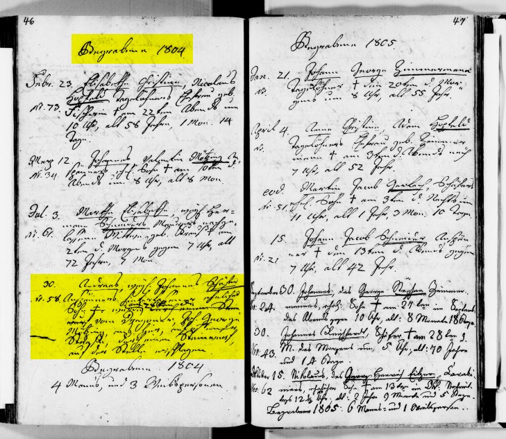 Seite 46 des Widdershäuser Kirchenbuches unter "Begrabene 1804"