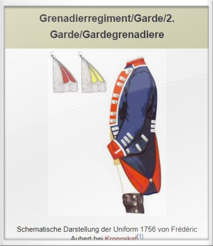 Hier handelt es sich um die Uniform des Grenadierregimentes 2. Bataillon Garde 1756, das Regiment, welches an der Erstürmung der Burg Ulrichstein 1759 teilnahm.