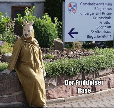 Friedlos![]() | Friddelser Hasen Warum es gerade Hasen sind, die damals dort aufgestellt wurden, erklärt sich aus der Geschichte des Dorfes Friedlos, die Einwohner wurden und werden auch heute noch als „Die Friddelser Sandhasen“ bezeichnet. Folglich ist der Hase auch das Wappentier der Friedloser. Ob die Osterhasen deswegen den Friedlosern mehr Ostereier ins Osternest legen als anderswo, konnte bis heute noch nicht geklärt werden. | |