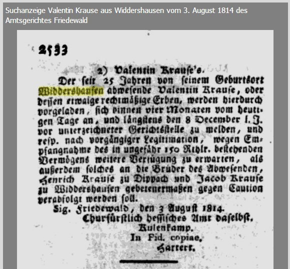 Der seit 25 Jahren von seinem Geburtsort Widdershausen abwesendeValentin Krause, oder dessen rechtmäßige Erben, werden hierdurch vorgeladen, sich binnen 4 Monaten vom heutigen Tage an, und längstens den 8. Dezember i. J. vor unterzeichneter Gerichtsstelle zu melden, und resp. nach vorgängiger Legitimation, wegen Empfangnahme des in ungefähr 150 Reichstaler bestehenden Vermögens weitere Verfügung zu erwarten, als außerdem solches an die Brüder des Abwesenden, Henrich Krause in Dippach und Jakob Krause zu Widdershausen gebetenermaßen gegen Kaution verabfolgt werden soll.