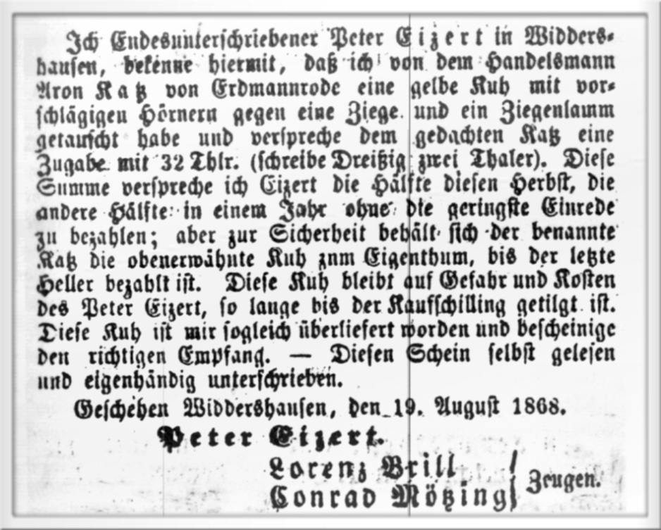 Ich Endesunterschriebener Peter Eitzert in Widdershausen, bekenne hiermit, dass ich von dem Handelsmann Aron Katz von Erdmannrode eine gelbe Kuh mit vorschlägigen Hörnern gegen eine Ziege und ein Ziegenlamm getauscht habe und verspreche dem gedachten Katz eine Zugabe mit 32 Thlr. (schreibe Dreißig zwei Thaler). Diese Summe verspreche ich Eitzert die Hälfte diesen Herbst, die andere Hälfte in einem Jahr ohne die geringste Einrede zu bezahlen; aber zur Sicherheit behält sich der benannte Katz die obenerwähnte Kuh zum Eigenthum, bis der letzte Heller bezahlt ist. Diese Kuh bleibt auf Gefahr und Kosten des Peter Eitzert, so lange bis der Kaufschilling getilgt ist. Die Kuh ist mir sogleich überliefert worden und bescheinige den richtigen Empfang. – Diesen Schein selbst gelesen und eigenhändig untergeschrieben.
