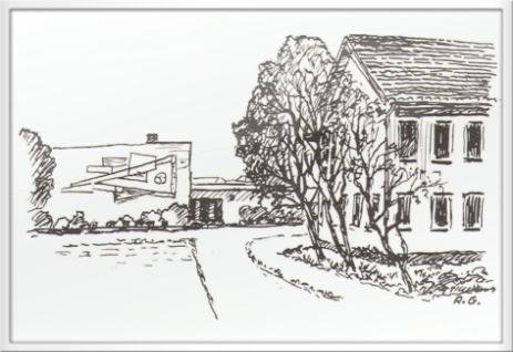 Federzeichnung der Mehrzweckhalle (Grundsteinlegung 1963) Widdershausen rechts daneben das alte Schulgebäude