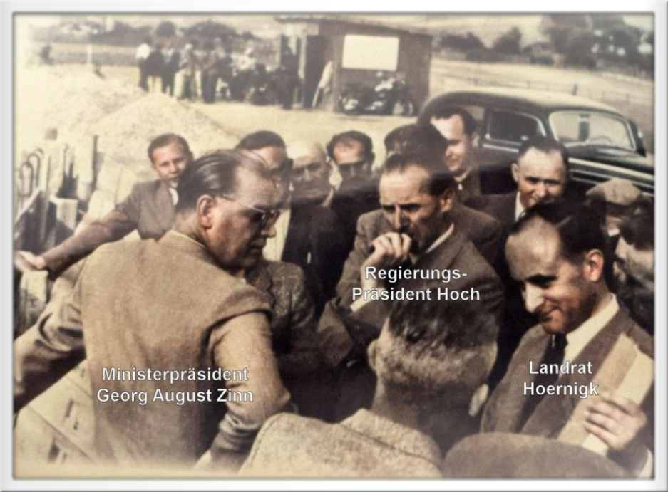 Ministerpräsident Georg August Zinn mit Landrat Hoernigk an der Baustelle der Mehrzweckhalle und an der Zonengrenze in Widdershausen