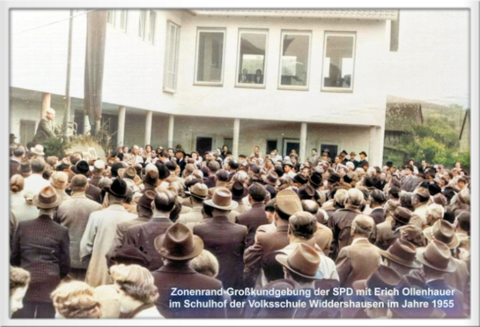 Erich Ollenhauer zusammen mit Widdershäuser SPD-Mitgliedern im Schulhof der alten Widdershäuser Schule. Paul Brosey war der damalige Hauptlehrer an der Volksschule Widdershausen.