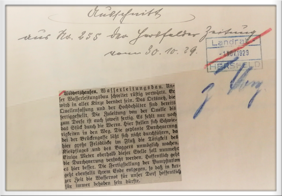 Wasserleitungsbau - Zeitungs-Ausschnitt aus der Hersfelder Zeitung vom 30. Oktober 1929