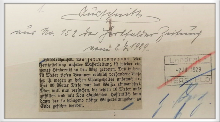 Wasserleitungsbau - Zeitungs-Ausschnitt aus der Hersfelder Zeitung vom 2. Juli 1929