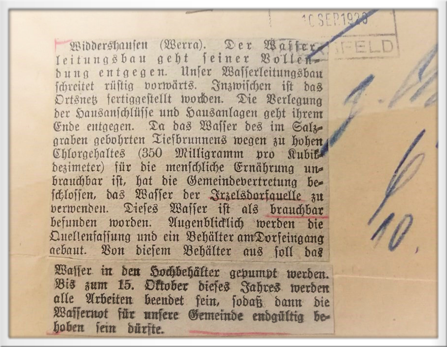 Unser Wasserleitungsbau schreitet rüstig vorwärts. Er wird in aller Kürze beendet sein. Das Ortsnetz, die Quellenfassung und der Hochbehälter sind bereits fertiggestellt. Die Zuleitung von der Quelle bis zum Dorfe ist auch soweit fertig. Es fehlt nur noch das Stück durch die Werra. Hier stellen sich Schwierigkeiten in den Weg. Die geplante Durchquerung bei der Brückengasse läßt sich nicht durchführen, da hier große Felsblöcke im Fluß die Tätigkeit des Kiespfluges und des Baggers unmöglich machen. Einige Meter oberhalb dieser Stelle soll nunmehr die Durchquerung versucht werden. Hoffentlich geht es hier besser. Die Fertigstellung der Pumpstation (Wiesen-Pumpenhaus) geht ebenfalls ihrem Ende entgegen, so daß in kurzer Zeit die Wassernot für immer behoben sein dürfte.