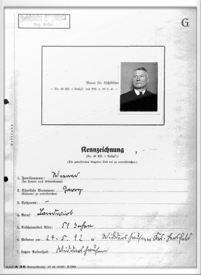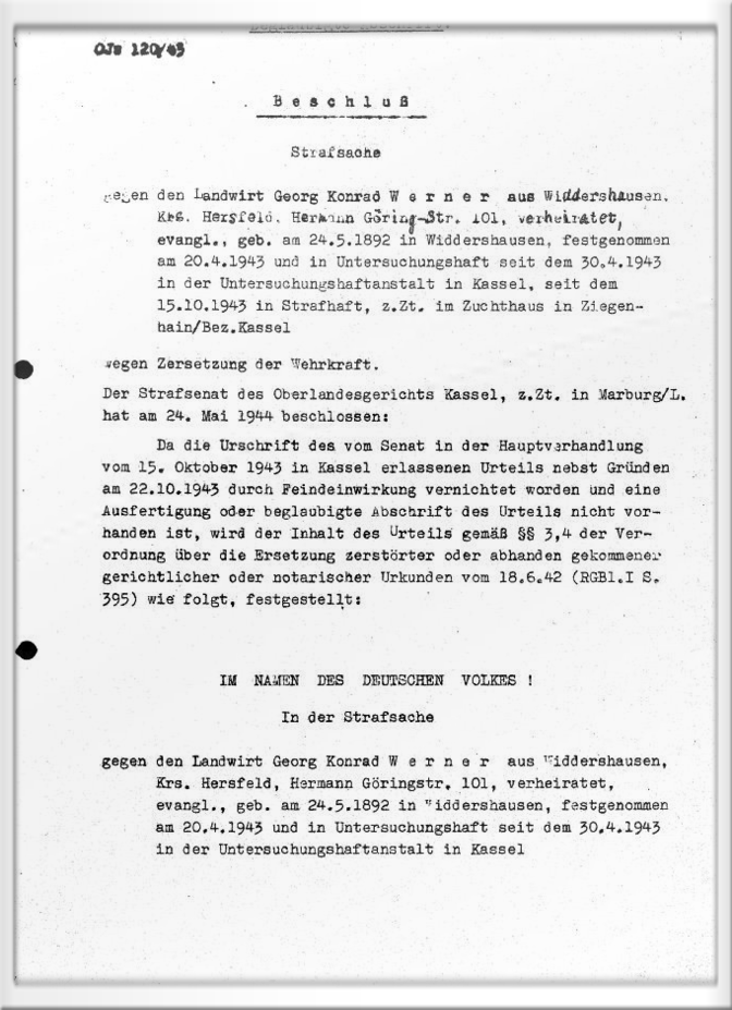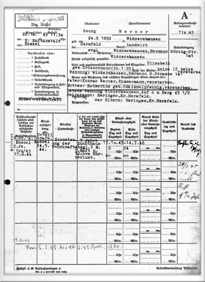 Der Landwirt Georg Werner geb. am 24. Mai 1892 in Widdershausen wird am 22.10.1943 aus der Untersuchungshaft in Kassel in das Zuchthaus Ziegenhain überführt.
