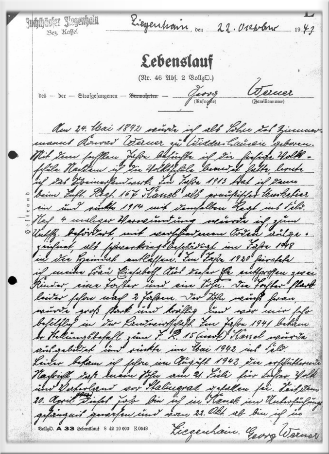 Lebenslauf durch Georg Konrad Werner am 22. Oktober 1943 im Zuchthaus Ziegenhain selbst geschrieben