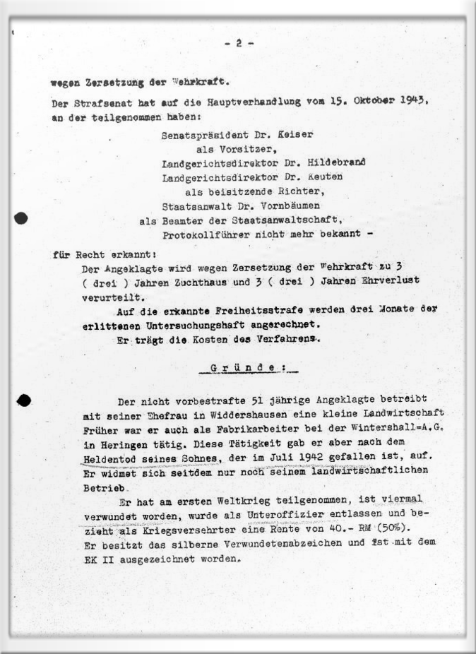 Wie dieser Fall zeigt, konnte auch in einem Dorf wie Widdershausen die Äußerung, dass der Krieg verloren ist, zu einigen Jahren Zuchthaus, Ehrverlust (Staatsfeind) und unter ungünstigen Umständen auch zur Todesstrafe führen. Noch nicht einmal seine schwere Verwundung im ersten Weltkrieg und der Verlust des Sohnes konnte Georg Werner vor einer Verurteilung schützen.