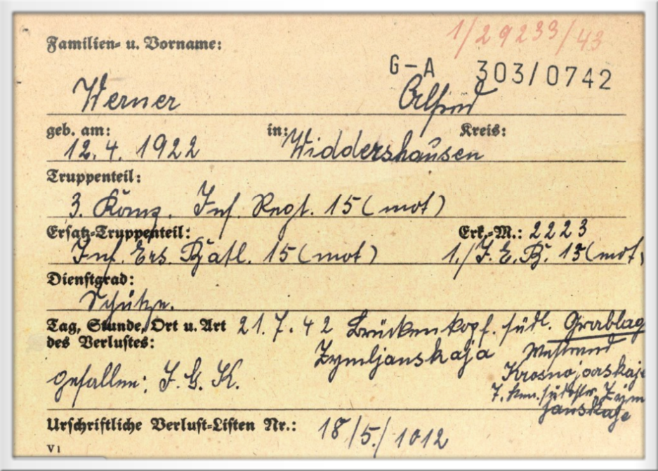 Karteikarte von Alfred Werner (1922-1942), des Sohnes von Georg Werner, aus der Verlustliste vom Juli 1942 der 3. Kompanie Infanterie Regiment 15 (mot).