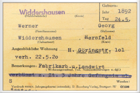 Personalkarte Bürgermeisteramt Widdershausen mit dem Zusatz: Verbüsst zur Zeit 3 Jahre Gefängnis als Staatsfeind