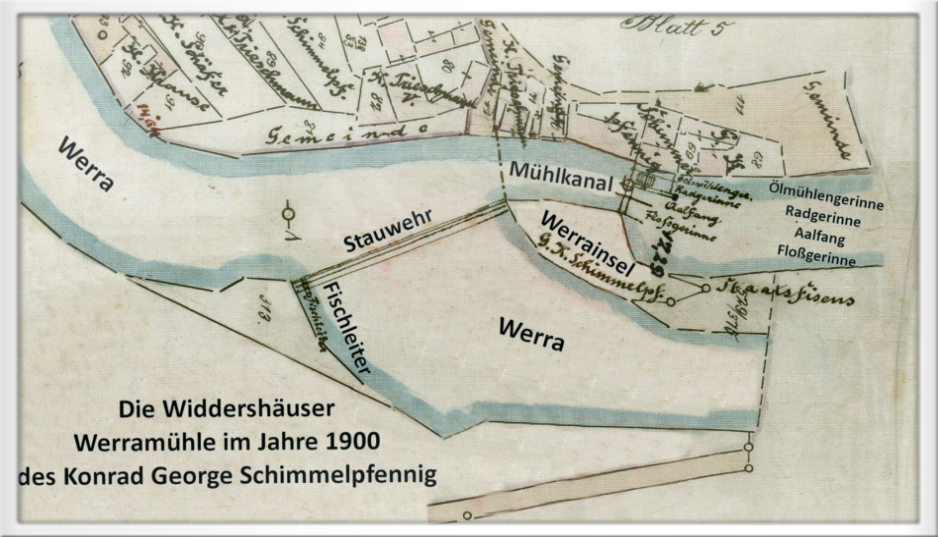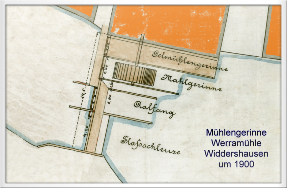 Die alte Werramühle in Widdershausen in 1900 vor dem Abriß und Umbau zur Zentrale 1904 durch das Kaliwerk Wintershall. Im alten Mühlkanal gut zu erkennen, das Ölmühlengerinne, das Radgerinne, den Aalfang, das Floßgerinne und das alte Stauwehr mit einer Fischleiter.