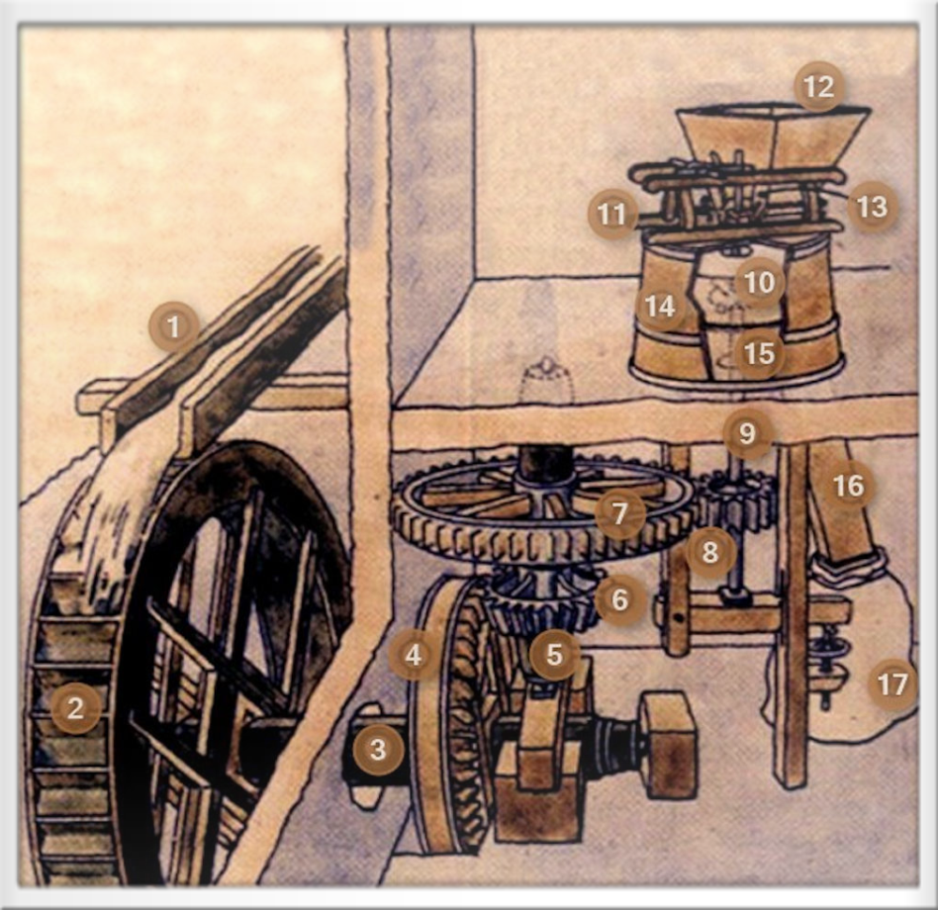 Das Kammrad treibt das auf der kurzen stehenden Welle (5) sitzende eiserne Kegelrad (6) und das darüber befindliche große Stirnrad (7), das aus einem eisernen Kranz mit hölzernen Armen und Zähnen besteht. Vom Stirnrad wird die Drehbewegung mittels eines kleinen eisernen Stirnrades (8) auf die Mahlgangswelle, das sogenannte Mühleisen (9), und den Läuferstein (10).
