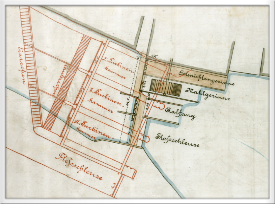 In den Grundriß der alten Werramühle von Georg Schimmelpfennig in Widdershausen hat man mit roter Tinte das Turbinenhaus der neuen Zentrale eingezeichnet, 1904