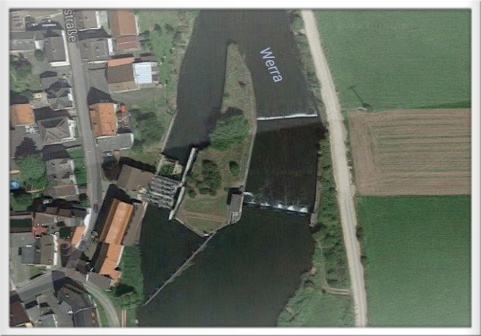 Das heutige Betriebsgebäude, die Werrainsel und das Wehr des Wasserkraftwerks in der Werrastraße 12 in Widdershausen 2017