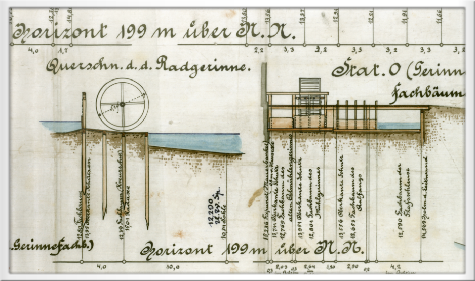 Das Wasserkraftwerk Widdershausen 1904, Querschnitt durch das Radgerinne und die Gerinnefachbäume, sehr schön zu sehen auch die Verankerung durch die Fachbäume