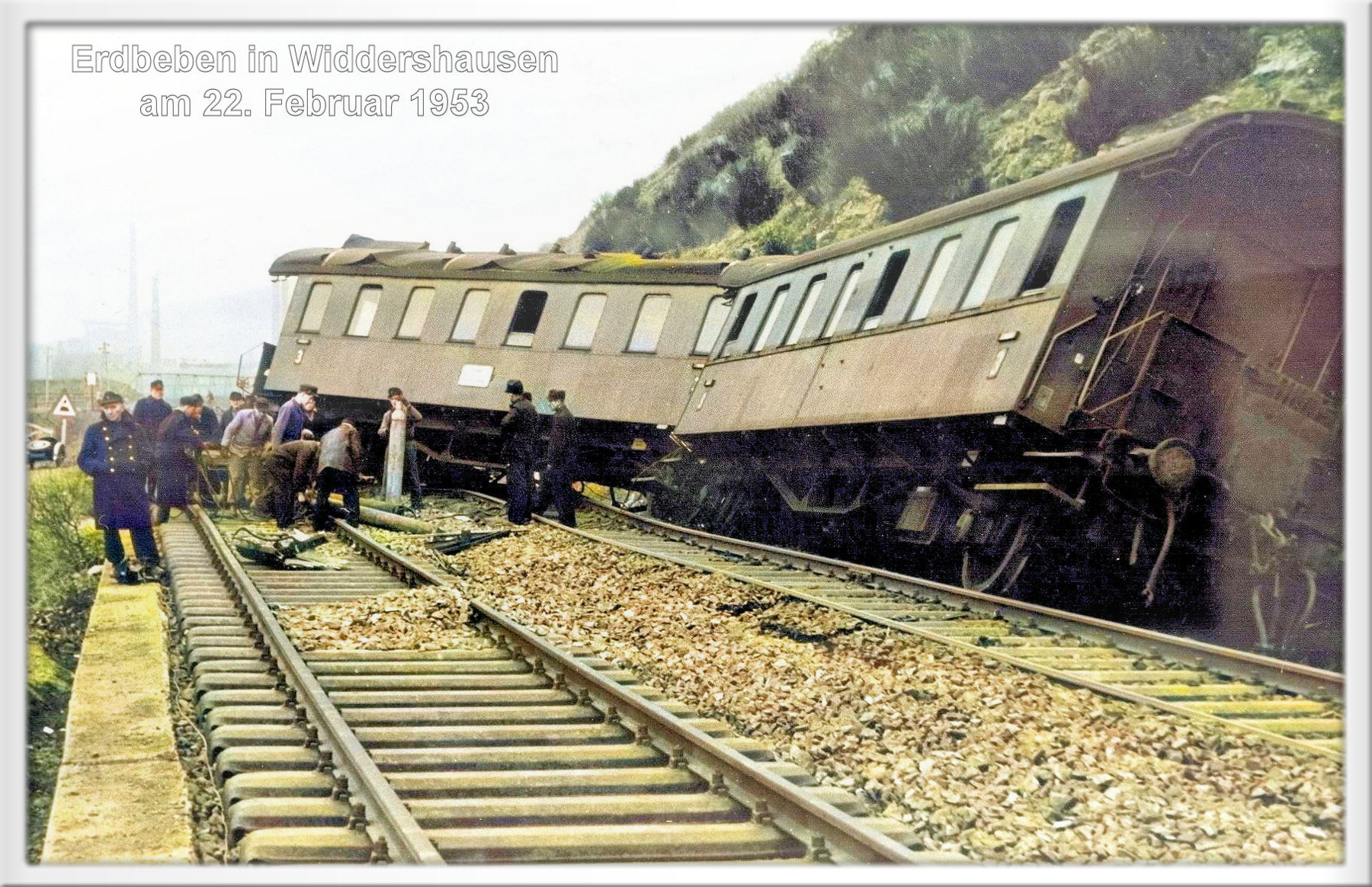 Entgleister Personenzug mit Schachtarbeitern zwischen Widdershausen und dem Kaliwerk Wintershall 1953